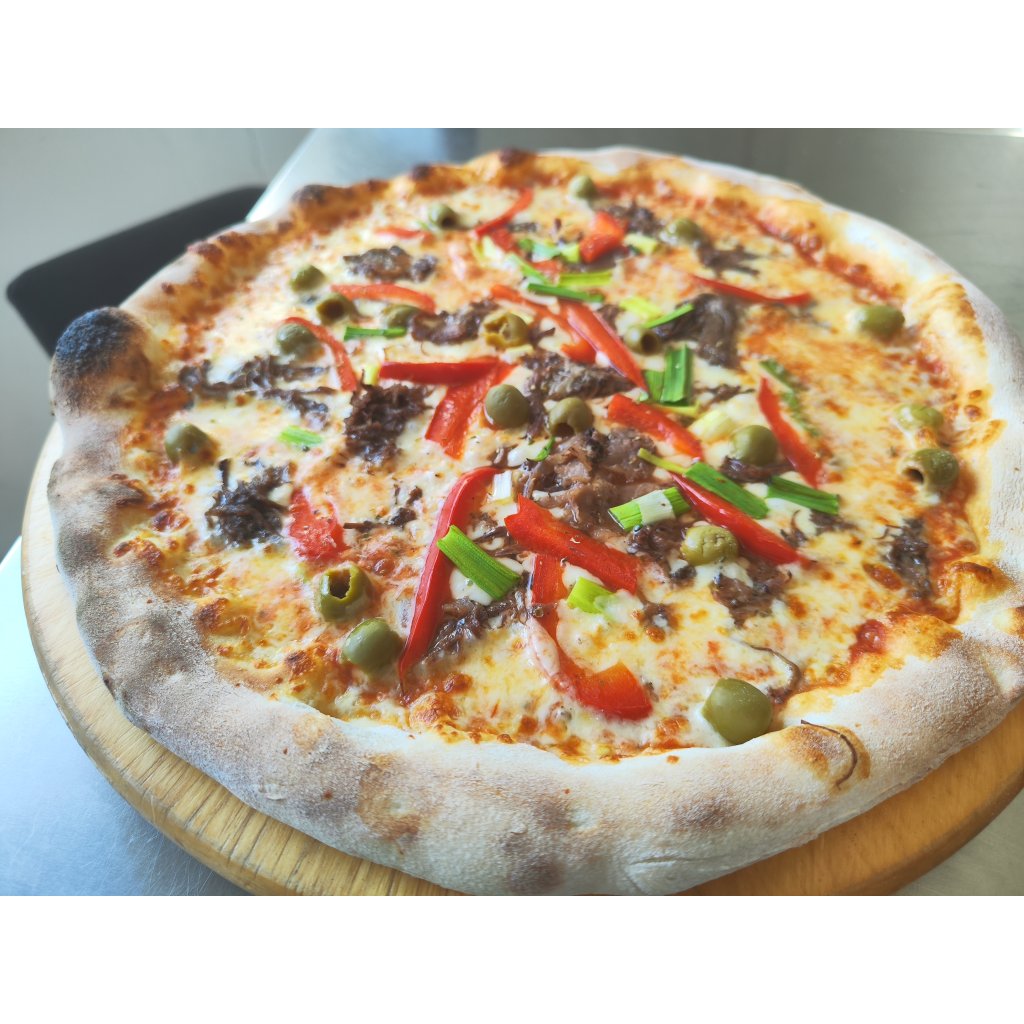 Tomato, mozzarella, trhané hovězí maso, jarní cibulka a,zelení olivy a sladká paprika